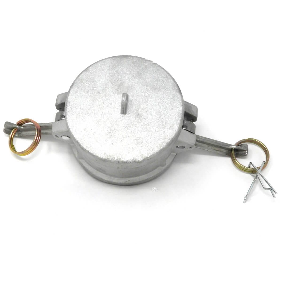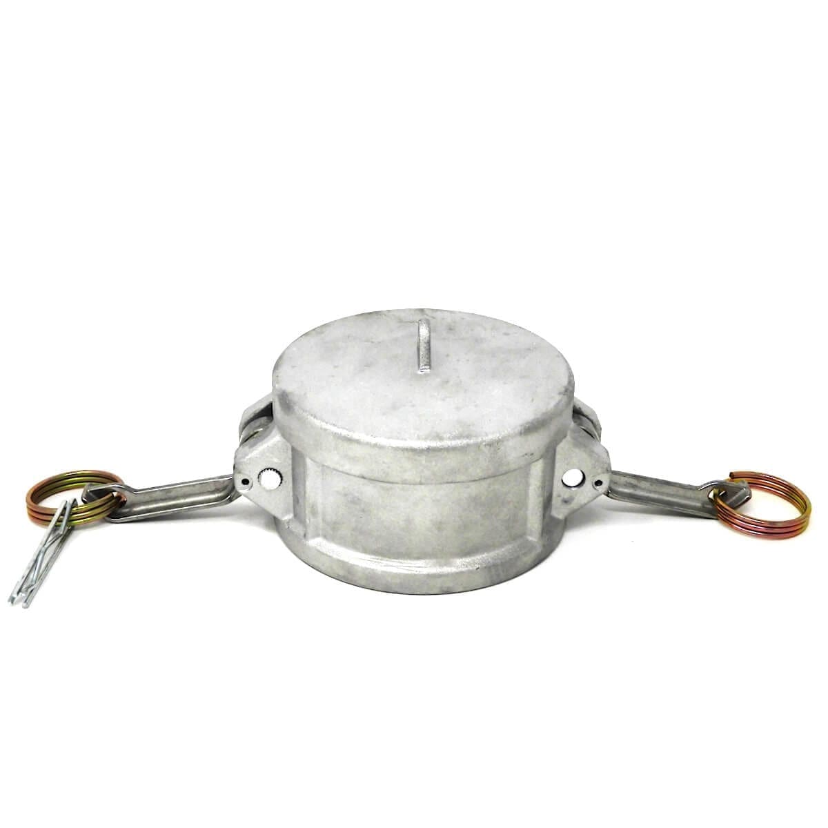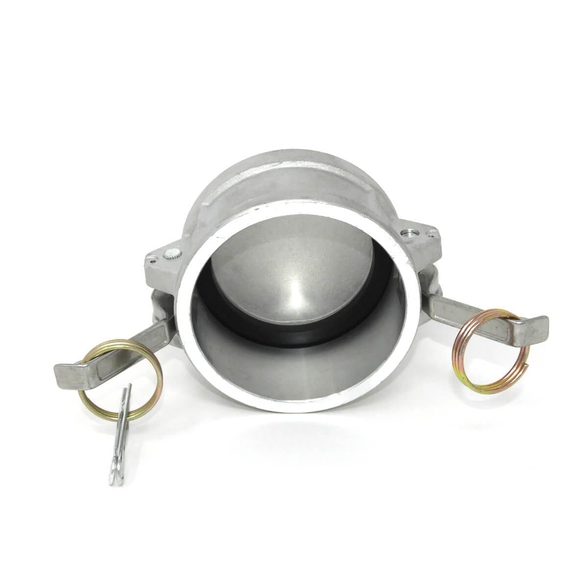 Gloxco brand aluminum 3″ cam and groove dust cap. This type DC camlock (Cam and Groove) fitting has a 3″ female quick connect coupling that attaches to a standard 3″ male cam and groove coupling. The body is made of aluminum. Aluminum cam lock fittings are lightweight and are corrosion and abrasion resistant. This fitting’s seal is made of NBR (Buna-N) rubber. Buna-N seals are resistant to fuel, oil, and other chemicals. The cam arms are made of stainless steel and includes two locking cotter pins. These cam and groove fittings are suitable for use with water, hydraulic oils, coolants, gasoline, and other petroleum products.