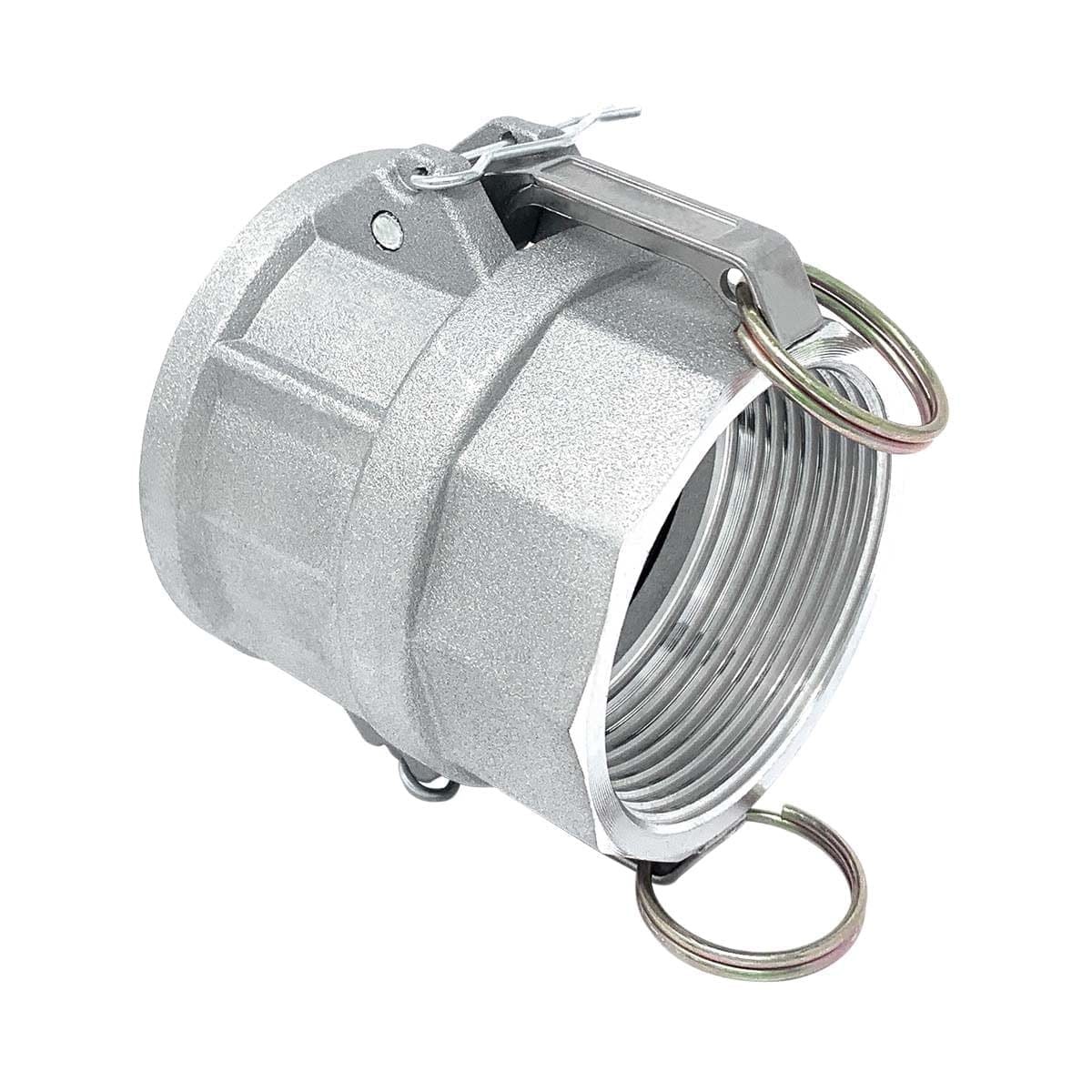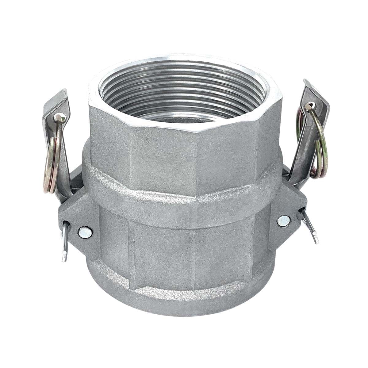 Gloxco brand aluminum type D cam and groove fitting. This type D camlock (Cam and Groove) fitting has a 2-1/2″ female camlock quick connect coupling on one side and a 2-1/2″ female NPT theads on the other side. The female camlock side of this coupler will only attach to a 2-1/2″ male camlock. The female threaded side will connect to a male NPT (National Pipe Tapered) threaded pipe. The body of this cam and groove fitting is made of aluminum. Aluminum cam lock fittings are lightweight and are corrosion and abrasion resistant. This fitting’s seal is made of NBR (Buna-N) rubber. Buna-N seals are resistant to fuel, oil, and other chemicals. The cam arms are made of stainless steel and includes two locking cotter pins. These cam and groove fittings are suitable for use with water, hydraulic oils, coolants, gasoline, and other petroleum products.