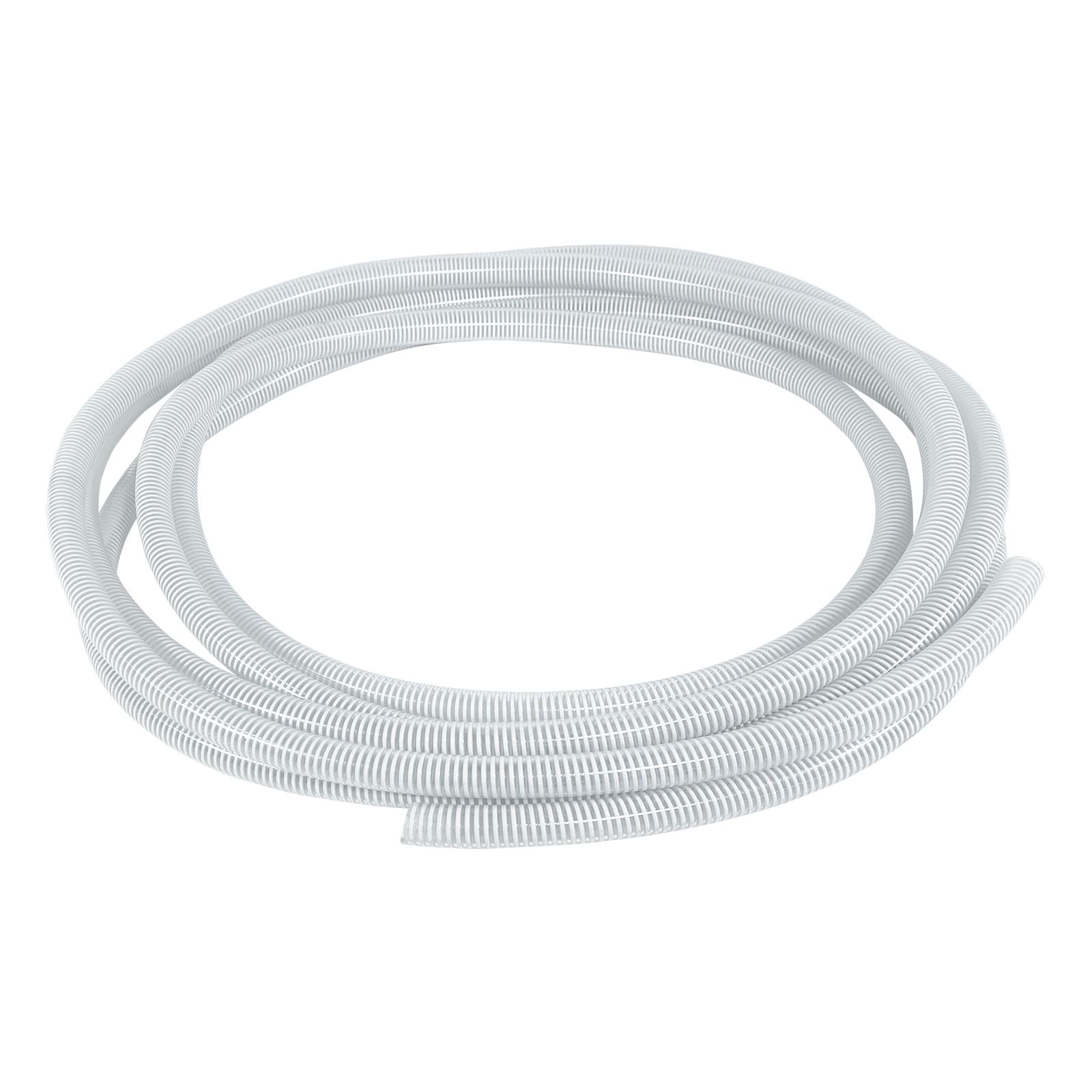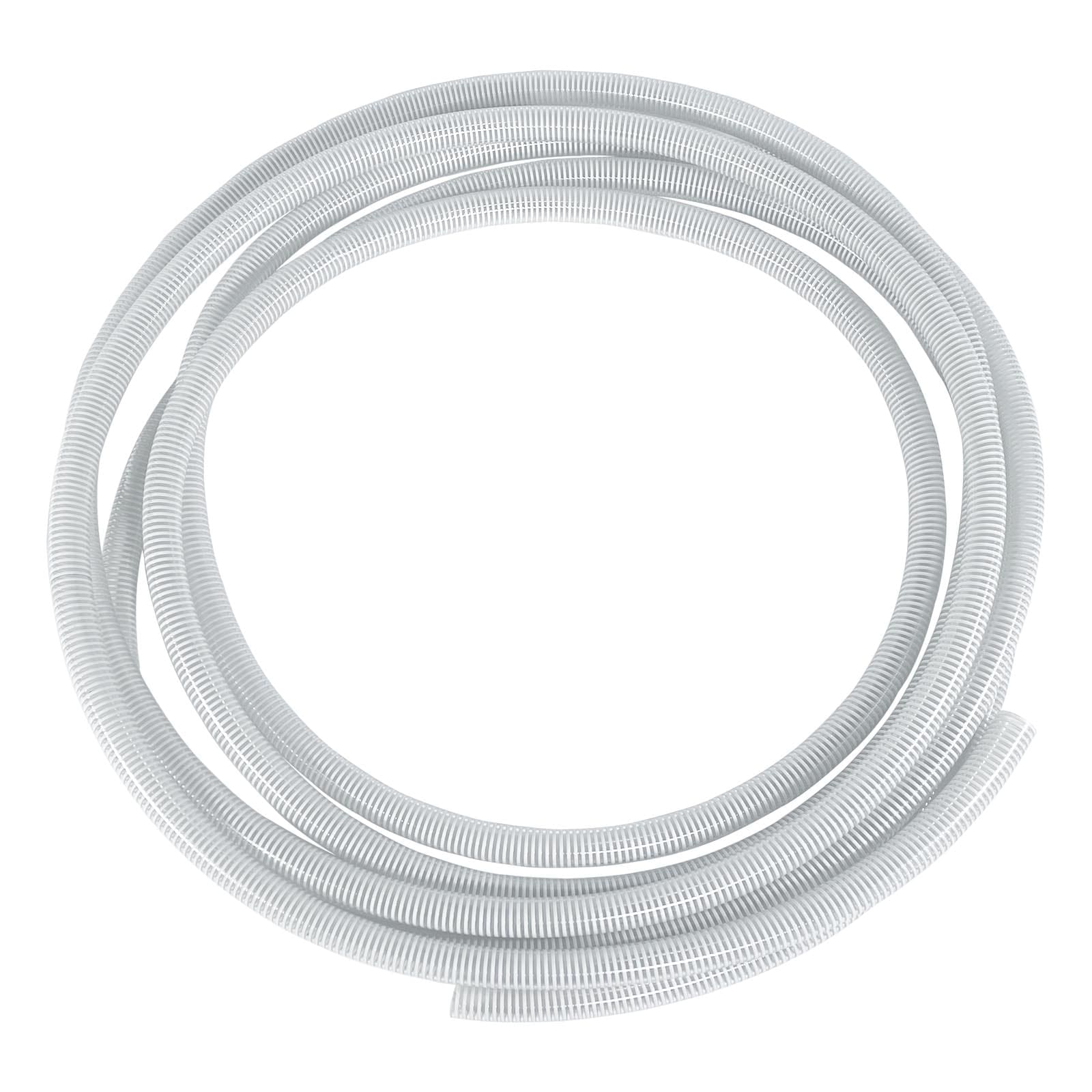 The hose is made of flexible clear PVC and is reinforced by a rigid white PVC helix. It has a working temperature range of -4° F to +150° F.