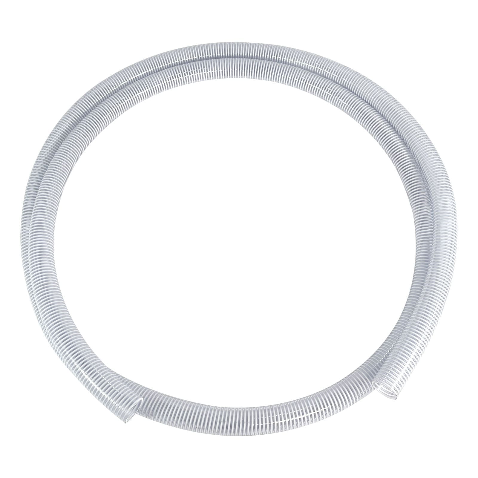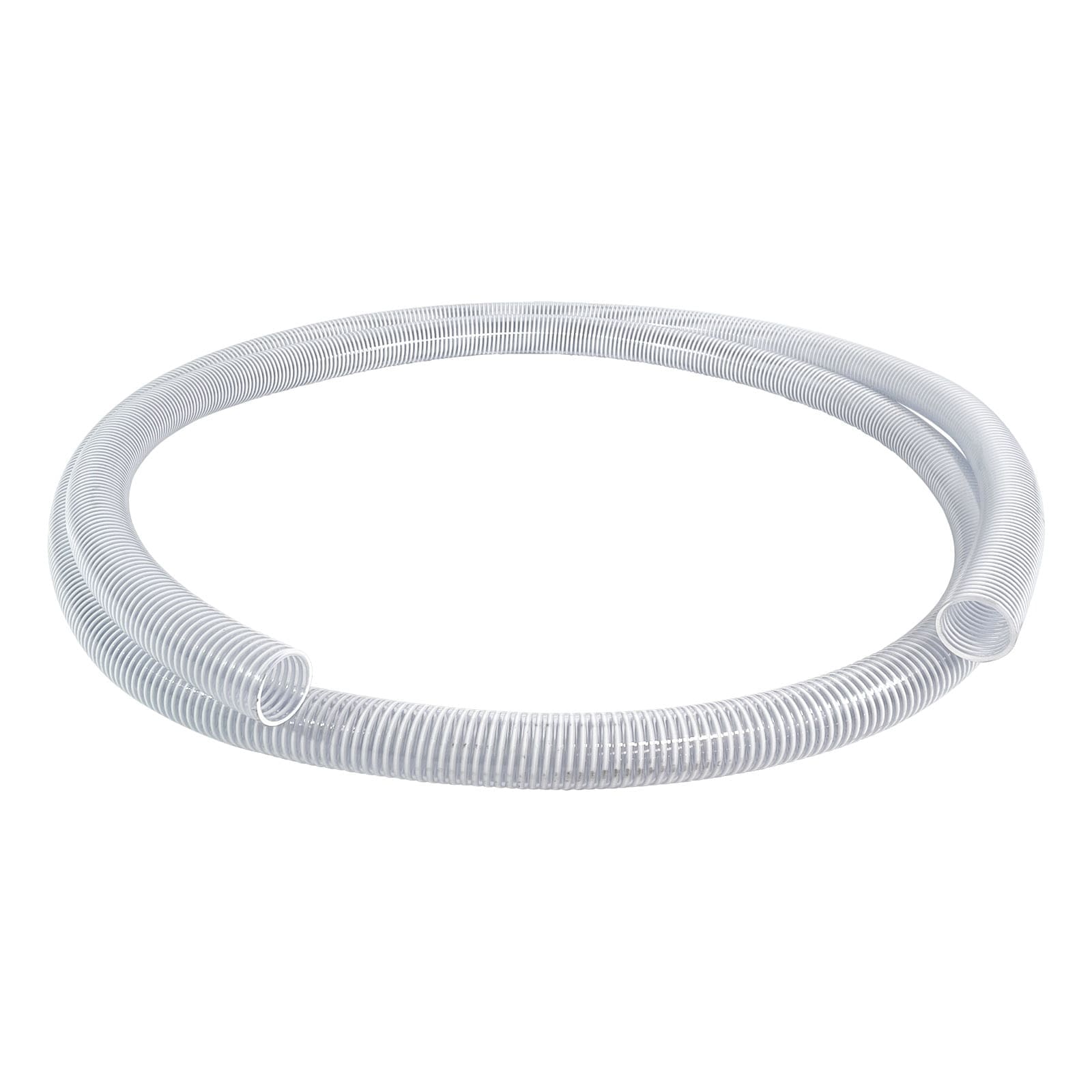 The hose is made of flexible clear PVC and is reinforced by a rigid white PVC helix. It has a working temperature range of -4° F to +150° F.