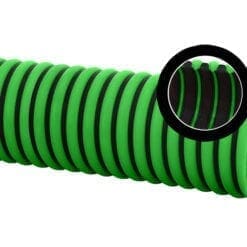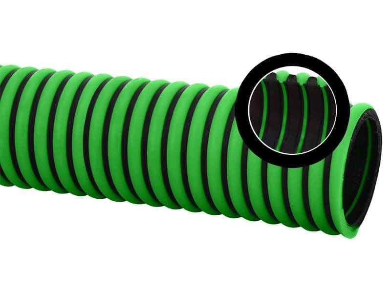 The green EPDM suction hose is made of flexible green EPDM and is reinforced by a rigid lime-green polyethylene helix. It has a working temperature range of -40° F to +180° F. This is a hose assembly has an aluminum Type C Female cam and groove fitting installed on one side and plated steel male NPT KC nipple installed on the other side.