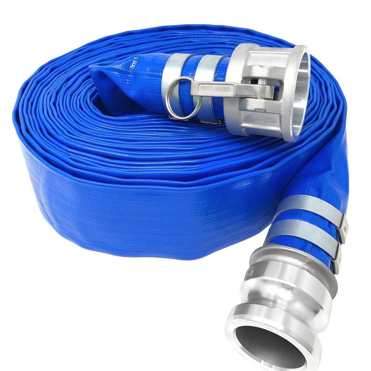 The blue lay flat PVC hose is a strong, lightweight hose designed for discharge applications. The hose is made of lay flat blue PVC and is reinforced by a 2 spiral piles. It has a working temperature range of -5° F to +130° F. This is a hose assembly has an aluminum Type E male cam and groove fitting installed on one side and an aluminum Type C female cam and groove fitting installed on the other side.