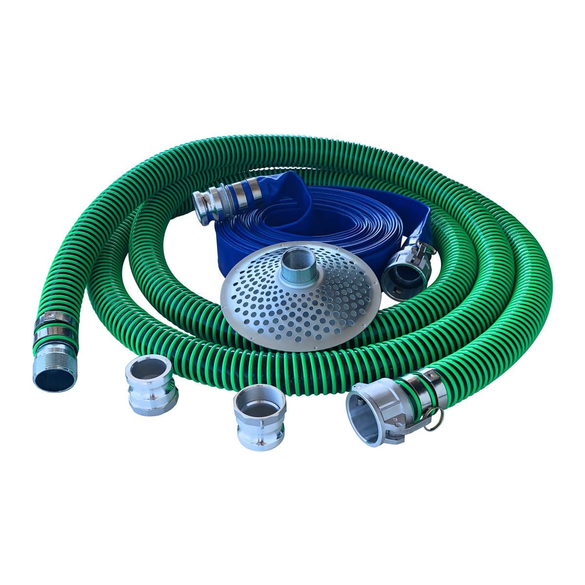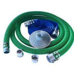 This Gloxco pump Hose Kit includes the hose parts you need for your water transfer pump. This pump kit includes the following: One 2″ x 20′ green EPDM suction hose assembly with a female camlock fitting on one side and male NPT threads on the other side. One 2″ x 50′ blue lay flat PVC discharge hose assembly with Male x Female camlock fittings. One 2″ skimmer suction strainer. Two additional 2″ type A aluminum cam and groove fittings.