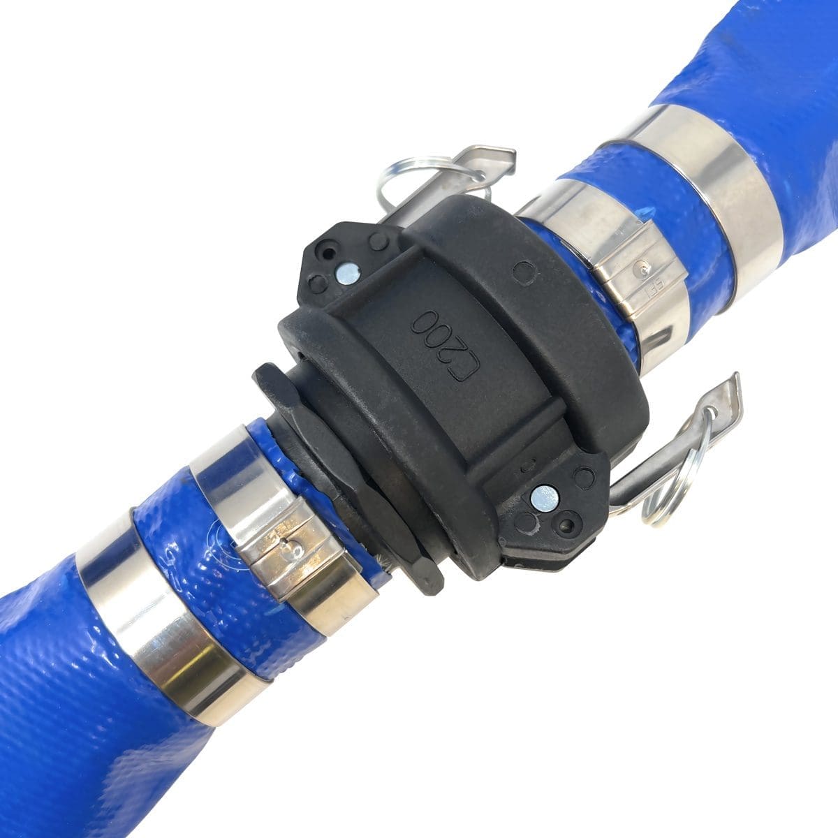 This is a hose assembly has a poly Type E male cam and groove fitting installed on one side and a poly Type C female cam and groove fitting installed on the other side. These assemblies are installed with two punch lock hose bands/clamps per side.