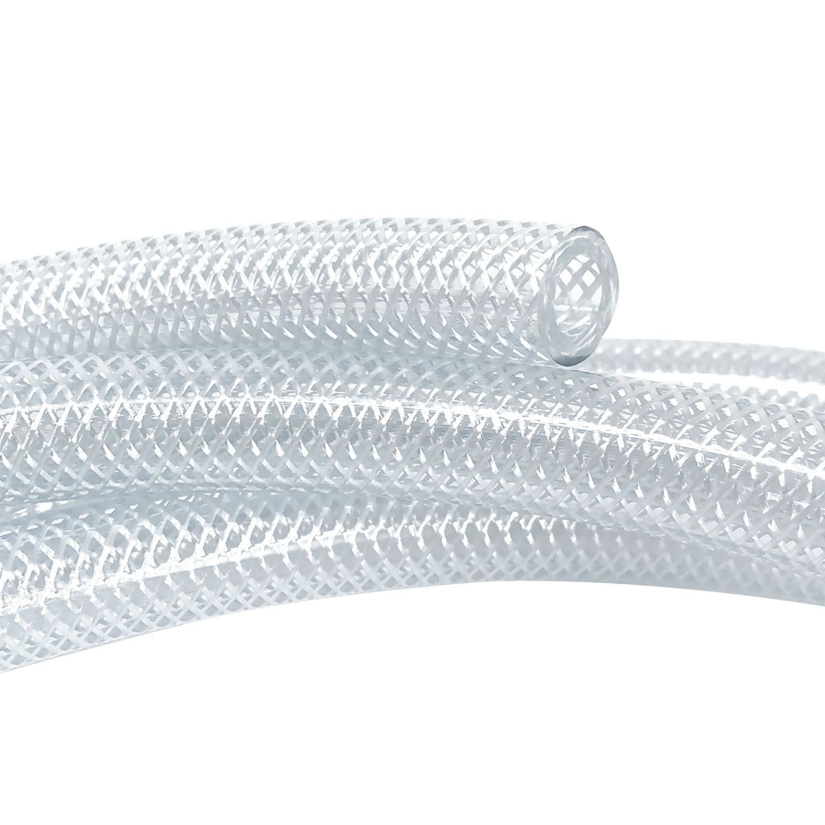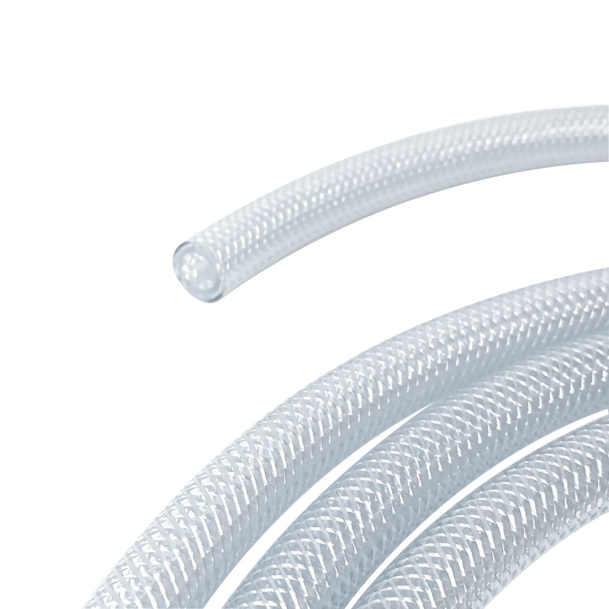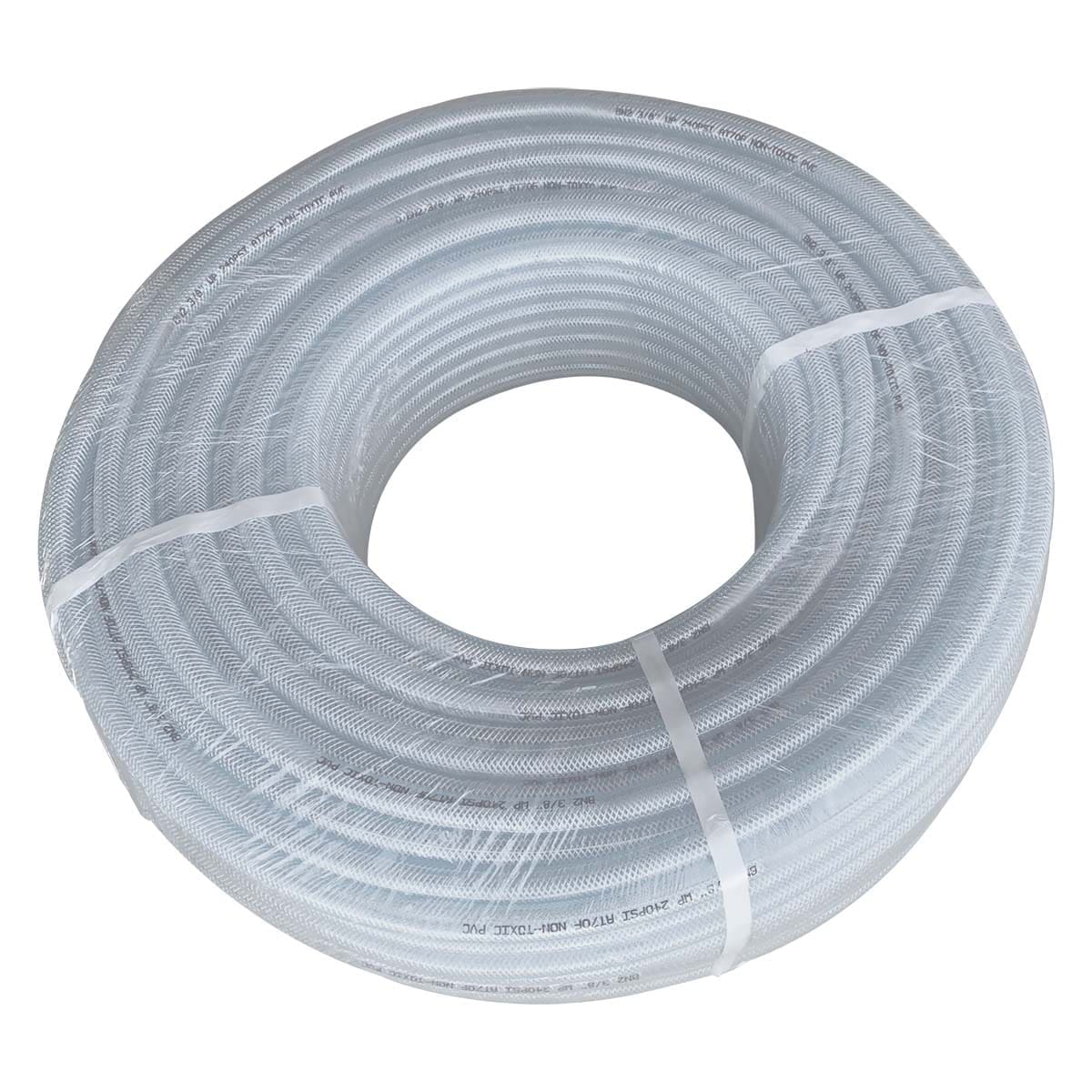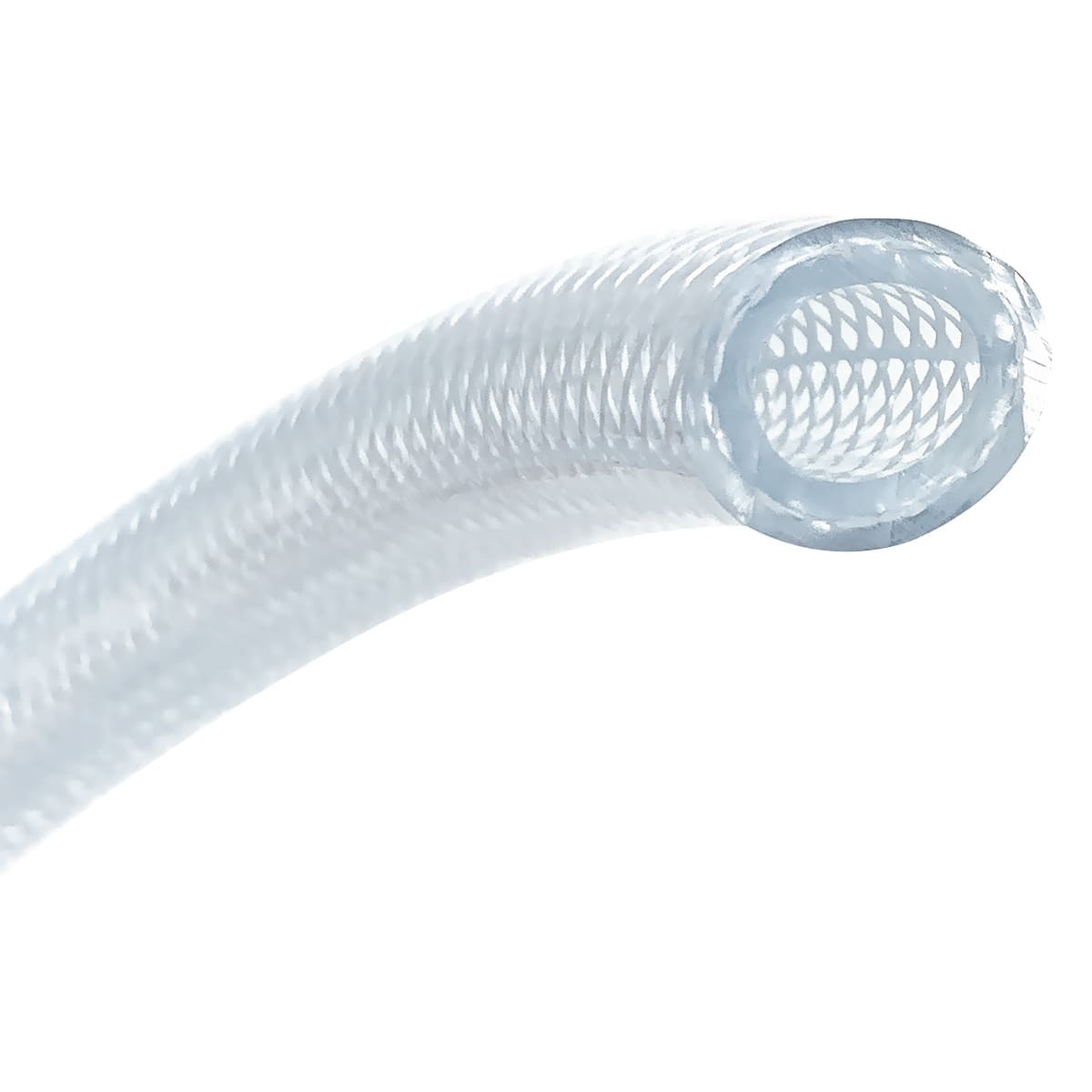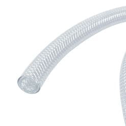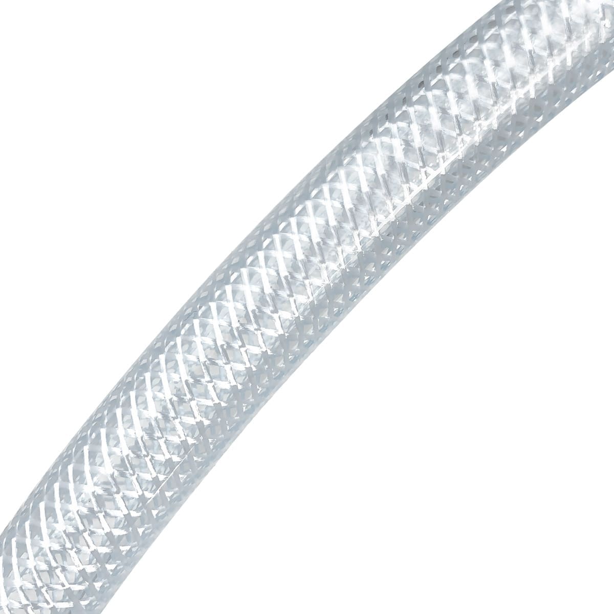 The hose is made of clear PVC tubing reinforced with a braided polyester yarn. It is phthalate free and made with non-toxic materials in compliance with FDA, NSF, and RoHS requirements. The hose has a smooth interior for unrestricted material flow, low friction loss and quiet substance transfer.