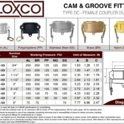 Warning: Type DC cam and groove fittings, or any other camlock fitting, should not be used for compressed air or steam.