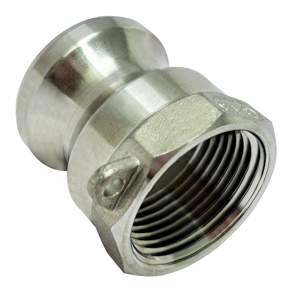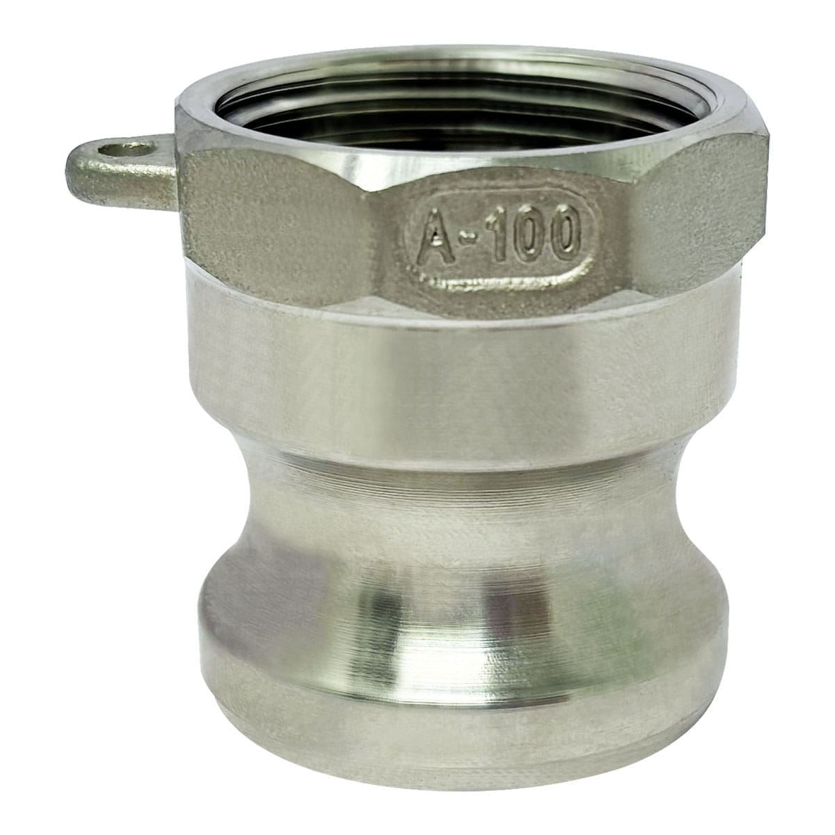 Gloxco brand stainless steel type A cam and groove fitting. This type A camlock (Cam and Groove) fitting has a 1″ male camlock quick connect coupling on one side and a 1″ female NPT theads on the other side. The male camlock side of this coupler will only attach to a 1″ female camlock. The female threaded side will connect to a male NPT (National Pipe Tapered) threaded pipe. The body of this cam and groove fitting is made of stainless steel. These 316 Stainless Steel cam lock fittings are corrosion and abrasion resistant. These cam and groove fittings are suitable for use with water, hydraulic oils, coolants, gasoline, and other petroleum products.