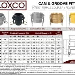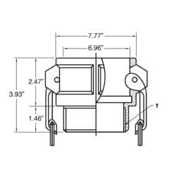 Gloxco brand stainless steel type D cam and groove fitting. This type D camlock (Cam and Groove) fitting has a 6″ female camlock quick connect coupling on one side and a 6″ female NPT theads on the other side. The female camlock side of this coupler will only attach to a 6″ male camlock. The female threaded side will connect to a male NPT (National Pipe Tapered) threaded pipe. The body of this cam and groove fitting is made of stainless steel. These 316 Stainless Steel cam lock fittings are corrosion and abrasion resistant. This fitting’s seal is made of NSS (Buna-N) rubber. Buna-N seals are resistant to fuel, oil, and other chemicals. The cam arms are made of stainless steel and includes two locking cotter pins. These cam and groove fittings are suitable for use with water, hydraulic oils, coolants, gasoline, and other petroleum products.