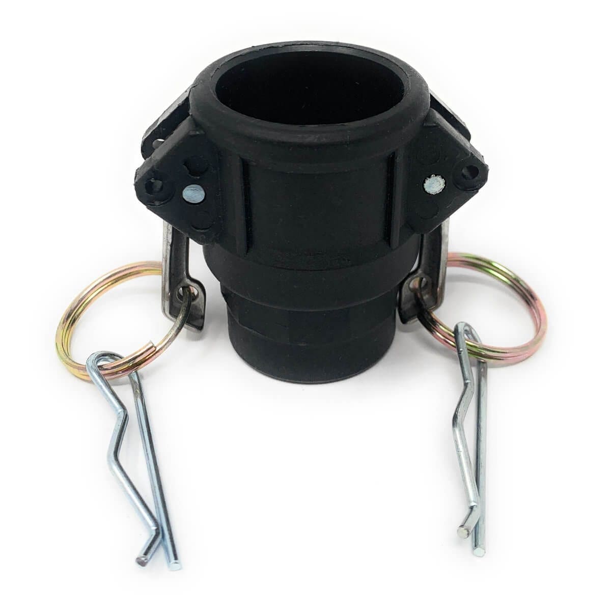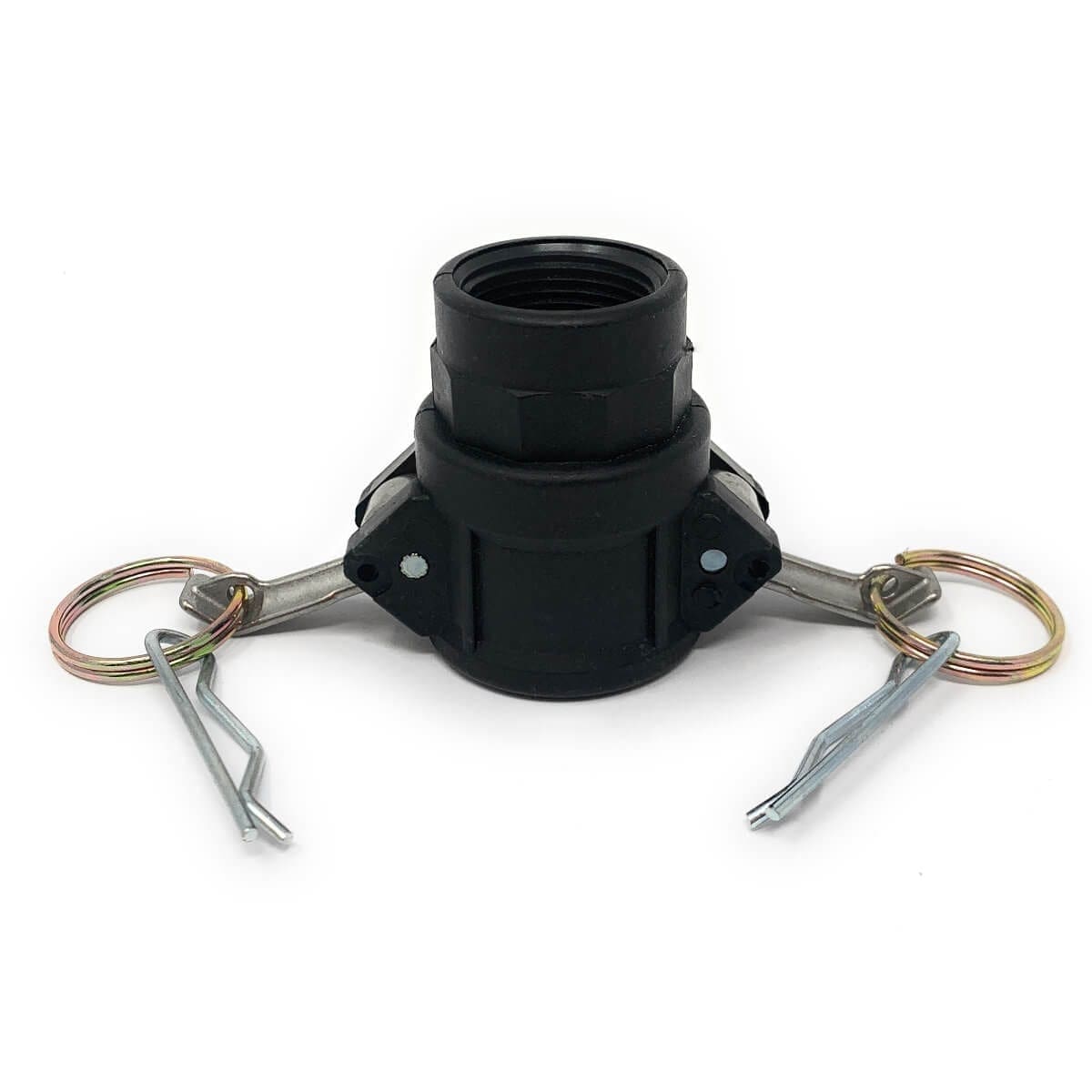 Gloxco brand polypropylene plastic type D cam and groove fitting. This type D camlock (Cam and Groove) fitting has a 3/4″ female camlock quick connect coupling on one side and a 3/4″ female NPT theads on the other side. The female camlock side of this coupler will only attach to a 3/4″ male camlock. The female threaded side will connect to a male NPT (National Pipe Tapered) threaded pipe. The body of this cam and groove fitting is made of polypropylene plastic. This Poly cam lock fitting is lightweight and resistant to abrasion, corrosion, and some chemicals. This fitting’s seal is made of NBR (Buna-N) rubber. Buna-N seals are resistant to fuel, oil, and other chemicals. The cam arms are made of stainless steel and includes two locking cotter pins. These cam and groove fittings are suitable for use with water, hydraulic oils, coolants, gasoline, and other petroleum products.